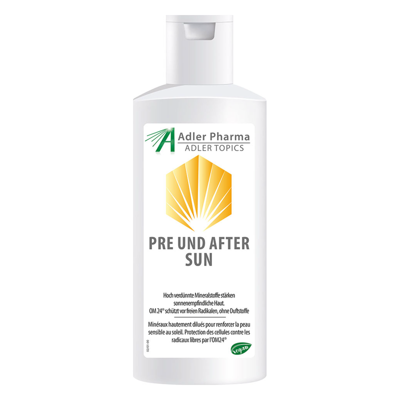 Die Sonne stellt für viele Menschen eine starke Belastung dar. Die Haut wird während des Sonnenbades vermehrt mit Freien Radikalen geschädigt. Die Vorbereitung der Haut ist daher ein wichtiges Thema. Daher ist OM24, ein natürlicher 24-Stunden-Zellschutz, eingearbeitet. Pre und After Sun mit Aloe Vera und OM24 ist auch für zu Sonnenallergie neigende Haut zu empfehlen. Schon einige Wochen vor dem ersten Sonnenbad sollte das Pre und After Sun mit Aloe Vera und OM24 regelmäßig angewendet werden, um die Haut vorzubereiten. Ebenso ist Pre und After Sun Gel nach dem Sonnenbad dafür geeignet, sonnenbeanspruchte Haut zu beruhigen und zu regenerieren. Es ist auch für sonnenempfindliche Kinderhaut geeignet.
