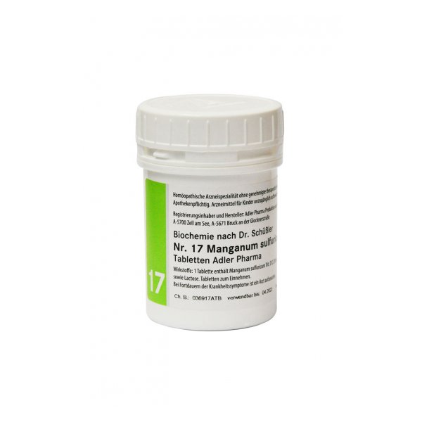 Die Nr. 17 ist ein wichtiger Energiespender in der Biochemie nach Dr. Schüßler und fördert den Kohlenhydratabbau. Es wird bei Überanstrengungskopfschmerz sowie bei Nerven- und Gedankenschwäche infolge Überarbeitung empfohlen. Dieser Mineralstoff wird weiters zum Aufbau einer guten physischen Leistungsfähigkeit eingesetzt.Die Nr. 17 fördert die Knorpelbildung, besonders in Kombination mit Nr. 8. Da sie die Durchblutung der Gefäße fördert, wird Sie in der Arteriosklerosevorsorge eingesetzt.