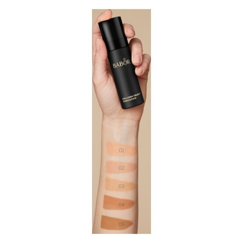 Collagen Deluxe Foundation pflegt die eher trockene Haut, deckt zuverlässig und verleiht dennoch einen gepflegten, natürlichen Look. Erhältlich in 5 Farben.