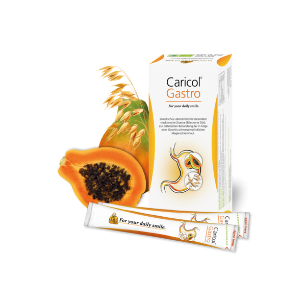 Caricol®-Gastro enthält die wertvollen Inhaltsstoffe einer patentierten Bio-Haferzubereitung sowie von Caricol®, einem patentierten Extrakt aus baumgereiften Bio-Papayas.