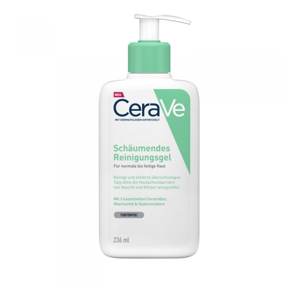 Das schäumende Reinigungsgel von CeraVe für Gesicht und Körper wurde mit Dermatologen entwickelt. Es schäumt sanft auf – ohne dabei den Schutz der natürlichen Hautbarriere anzugreifen. Das erfrischende Gel enthält 3 essenzielle Ceramide sowie Hyaluron und entfernt effektiv überschüssiges Fett, Schmutz und Make-up. Ohne Parfüm.