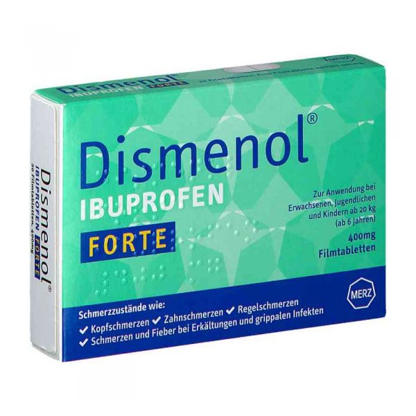 Ibuprofen, der wirksame Bestandteil von Dismenol forte Ibuprofen 400 mg, ist eine Substanz mit schmerzstillender, entzündungshemmender und fiebersenkender Wirkung. Anwendungsgebiete von Dismenol forte Ibuprofen 400 mg: Dismenol forte Ibuprofen 400 mg wird angewendet bei leichten bis mäßig starken Schmerzzuständen, wie z. B.: – Menstruationsbeschwerden, – Kopf-, Rücken-, Zahn-, Muskel-, Gelenksschmerzen, – Schmerzen bei Erkältungskrankheiten und grippalen Infekten.