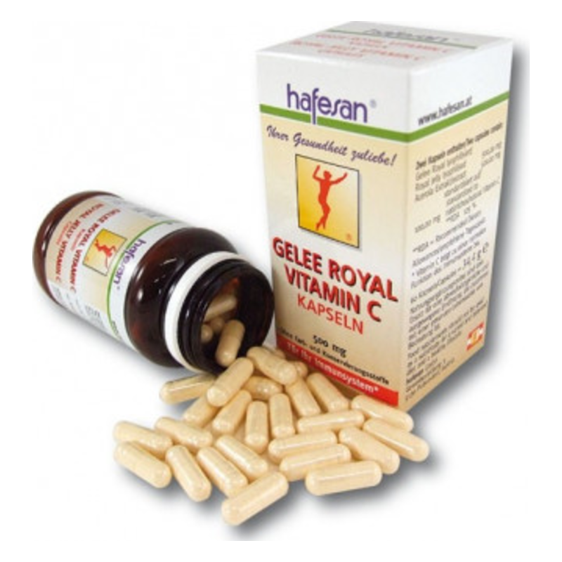 hafesan Gelee Royal Vitamin C Kapseln enthalten 250 mg hochwertiges lyophilisiertes (gefriergetrocknetes) Gelee Royal Pulver und 250 mg Acerola Extrakt (enthält Vitamin C).