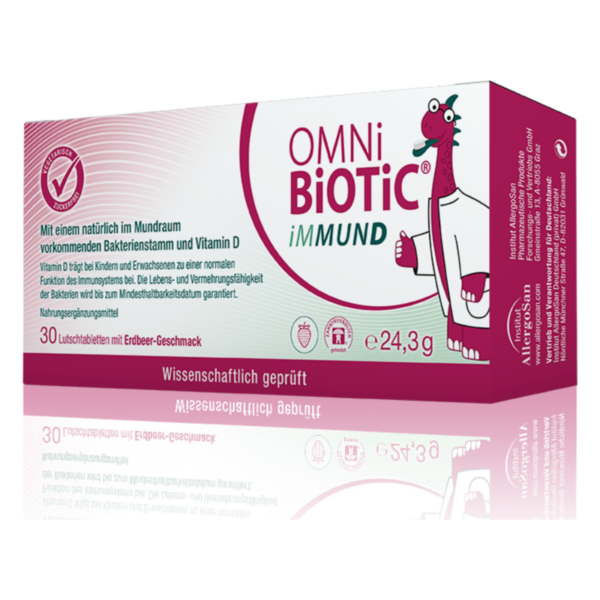 OMNi-BiOTiC® iMMUND enthält den in vielen Studien überprüften, natürlich im Mundraum vorkommenden Bakterienstamm Streptococcus salivarius K12 sowie Vitamin D. Dieses Vitamin sorgt bei Kindern und Erwachsenen für eine normale Funktion des Immunsystems.