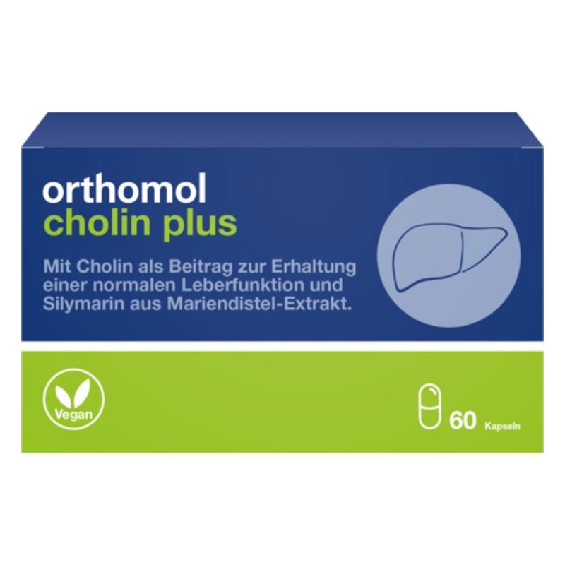 Orthomol Cholin Plus ist ein Nahrungsergänzungsmittel. Es enthält Cholin als Beitrag zur Erhaltung einer normalen Leberfunktion und Silymarin aus Mariendistel-Extrakt.