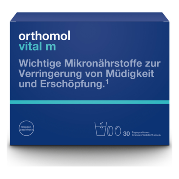 Insbesondere im hektischen Alltag wird eine ausgewogene Ernährung oft vernachlässigt. Wenn die Zeit knapp ist, greifen „Stressesser“ gern zu Fast Food und Süßigkeiten – mikronährstoffarmen Lebensmitteln; „Stresshungerer“ dagegen schränken die Nahrungsaufnahme in solchen Phasen stark ein. Dabei braucht der Körper gerade jetzt, in Phasen hoher Belastung, ausreichend Vitamine und Mineralstoffe, die er größtenteils nicht selbst bilden kann. Orthomol Vital m ist eine Mikronährstoffkombination für Männer. Es enthält wichtige Mikronährstoffe u.a. mit B-Vitaminen und Magnesium zur Verringerung von Müdigkeit und Erschöpfung. Enthält Omega-3-Fettsäuren.