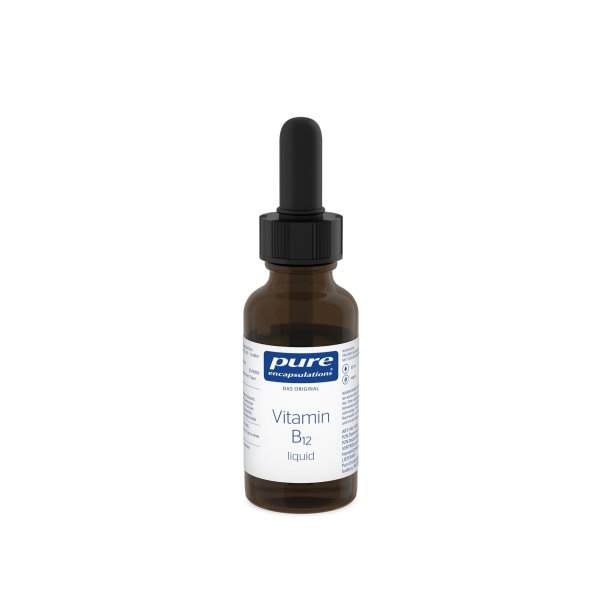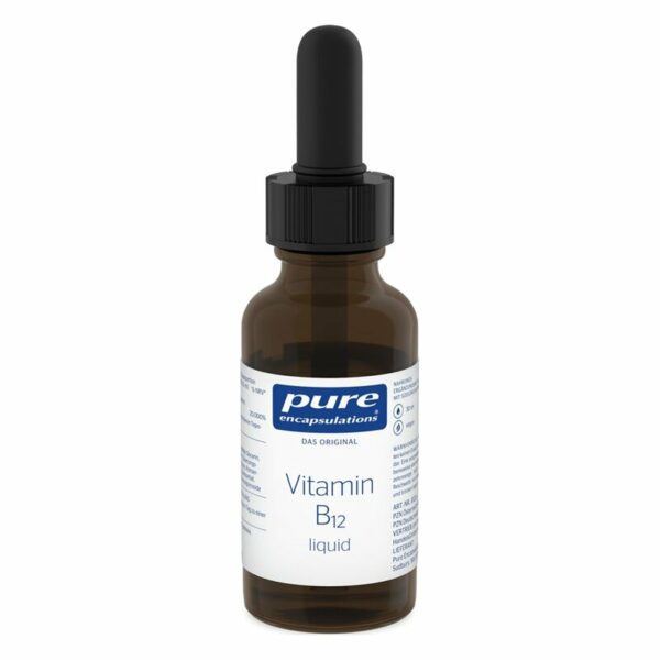 Vitamin B12 (Cobalamin) ist ein wasserlösliches Vitamin, das zu etwa 60% in der Leber und zu 30% in den Muskeln gespeichert werden kann. Aufgrund der guten Speichermöglichkeit macht sich eine mangelnde Versorgung erst nach längerer Zeit, aber dafür abrupt, bemerkbar. Da Lebensmittel tierischen Ursprungs die Hauptquellen für Vitamin B12 sind, profitieren besonders Veganer und Vegetarier von einer zusätzlichen Zufuhr. Auch ältere Personen können einen erhöhten Bedarf aufweisen, da die Resorption oft eingeschränkt ist oder auch die Einnahme bestimmter Medikamente die Vitamin-B12-Speicher im Körper vermindern kann.Vitamin B12 ist bedeutsam für die Bildung der roten Blutkörperchen und unterstützt die Funktionen des Nervensystems, da es ein wichtiger Cofaktor für die Bildung des Myelins (Bausubstanz der Nervenscheiden) ist. Gemeinsam mit den B-Vitaminen Folsäure und B6 ist Vitamin B12 an der Erhaltung des Homocystein-Stoffwechsel-Gleichgewichts maßgeblich beteiligt. Da Vitamin B12 wichtig für die Energieproduktion in den Mitochondrien ist, wird eine ausreichende Versorgung auch für den Energiestoffwechsel benötigt. Vitamin B12 liquid von Pure Encapsulations® greift auf die hochwertige und biologisch aktive Verbindung Methylcobalamin zurück, welche über Fermentation gewonnen wird. Das Produkt ist durch den integrierten Tropf-Verschluss einfach und individuell zu dosieren und stellt eine gute Alternative für Personen dar, die keine Kapseln schlucken möchten oder können. Vitamin B12 liquid schmeckt angenehm und kann Getränken oder Speisen beigemengt werden.