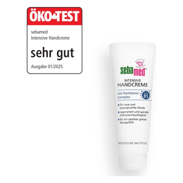 Intensive Pflege für raue und beanspruchte Hände Die Intensive Handcreme pflegt raue und beanspruchte Hände sofort und trägt zum Schutz vor Austrocknung bei. Die reichhaltige Pflege mit Panthenol und Allantoin spendet intensive Feuchtigkeit und fördert die Regeneration. Der Lipidkomplex mit Sheabutter und Avocadoöl hilft, die Hautglätte zu verbessern. Der pH-Wert 5,5 ist auf den natürlichen Hautschutzmantel abgestimmt und unterstützt so die Abwehr schädlicher Umwelteinflüsse. Die sehr gute Hautverträglichkeit ist klinisch dermatologisch getestet. Sebamed Intensive Handcreme eignet sich außerdem insbesondere für Menschen mit Allergien und Intoleranzen.