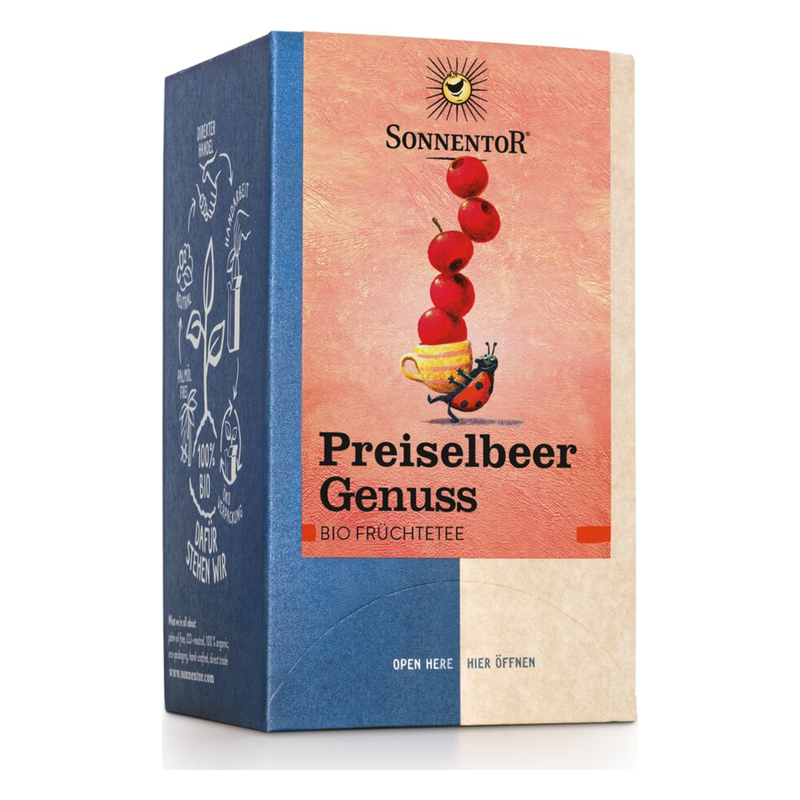 Preiselbeeren mögen wir besonders gerne! Deshalb haben wir auch diesen großartigen Tee kreiert. In einem intensiven Rot strahlt er aus der Tasse. Er schmeckt fruchtig nach Preiselbeeren, abgerundet durch eine Nuance frischer Orange. Der Tee harmoniert hervorragend mit Wildspezialitäten, Kuchen und pikanten Jausen. Einfach großartig!