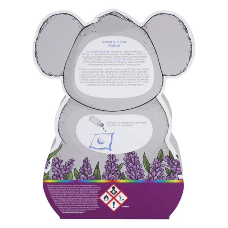 Das 'Schlaf Gut Kids' Duftset im niedlichen Koala-Design ist der perfekte Begleiter für alle kleinen Träumer. Dieses Set, bestehend aus unserer liebevoll entwickelten TAOASIS Duftkomposition 'Schlaf Gut Kids' und einem sanft duftenden Lavendel-Duftkissen, verwandelt das Kinderzimmer in einen friedvollen Rückzugsort. Mit entspannender Lindenblüte, harmonisierender roter Mandarine und besänftigender Vanille schafft es eine Oase der Entspannung, die dein Kind sanft auf die Reise ins Traumland vorbereitet. Die perfekt abgestimmten ätherischen Öle sorgen für eine ungestörte, ruhige Nacht. Positioniere das Duftkissen einfach neben dem Schlafplatz deines Kindes, um ihm einen sicheren und wohltuenden Schlaf zu ermöglichen.