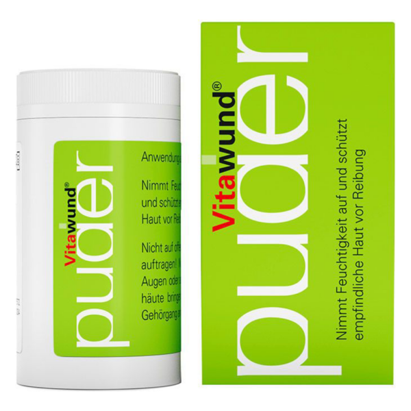 Vitawund Puder nimmt aufgrund seines austrocknenden Effektes Feuchtigkeit auf und schützt empfindliche Hautpartien wie Hautfalten, Achselhöhlen oder Zehenzwischenräume vor Reibung.